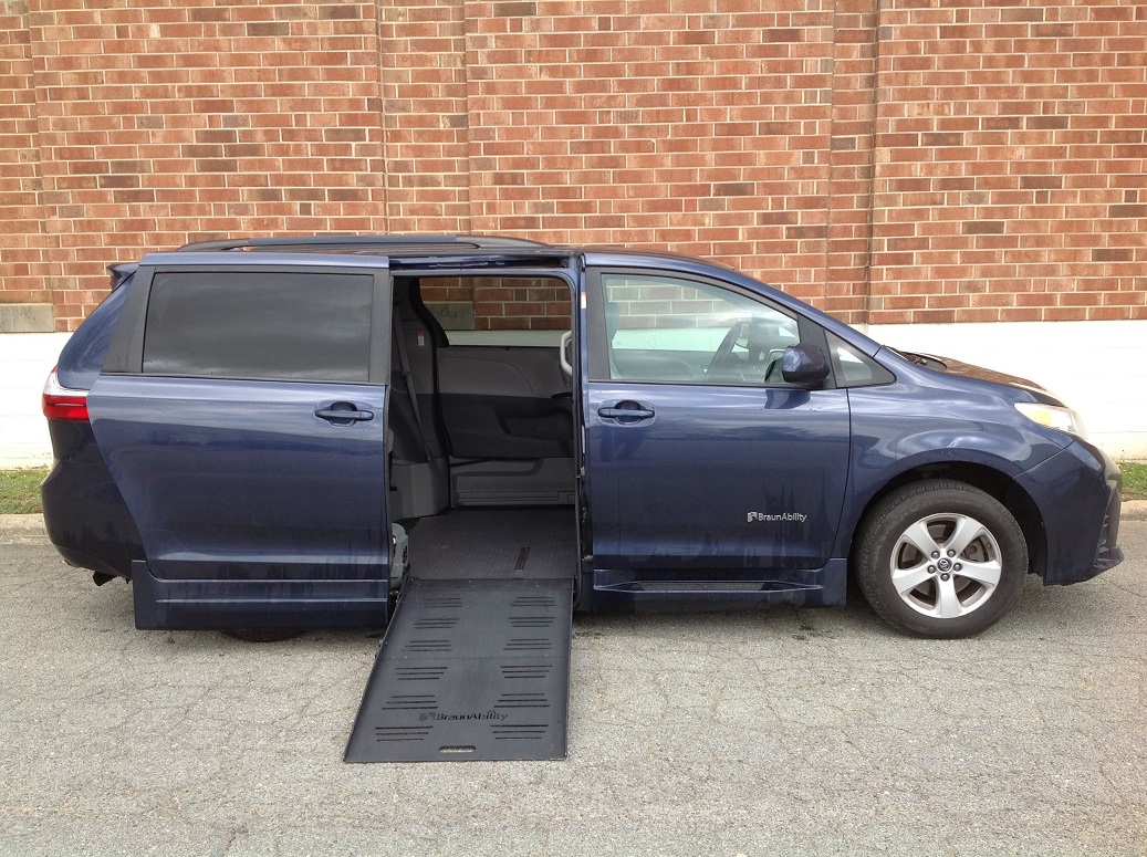 2018 Toyota Sienna LE, BraunAbility Rampvan XL power fold out conversion, cloth seats, power driver seat, power sliding doors, CD player, AM/FM/stereo, satellite radio, back up camera, cruise control, Bluetooth audio and phone, retractable tie downs. Disability Equipped, Handicap Accessible, Wheelchair accessible, Handicap van, Wheelchair van, Handicap vans, Wheelchair vans
