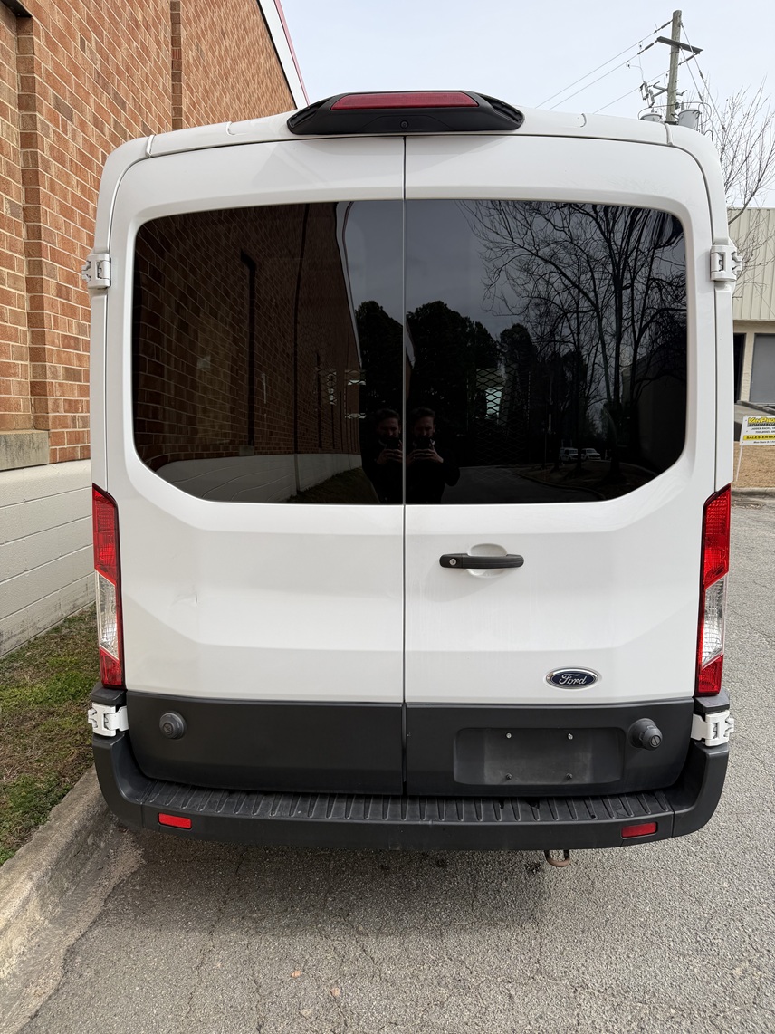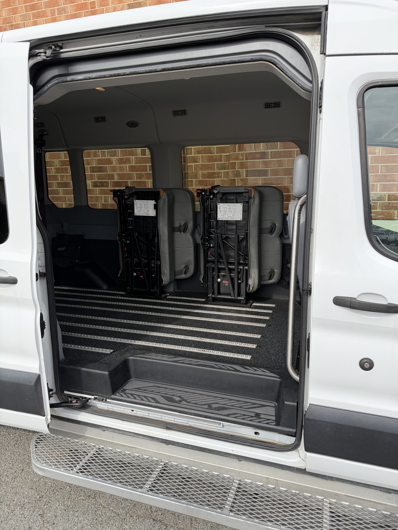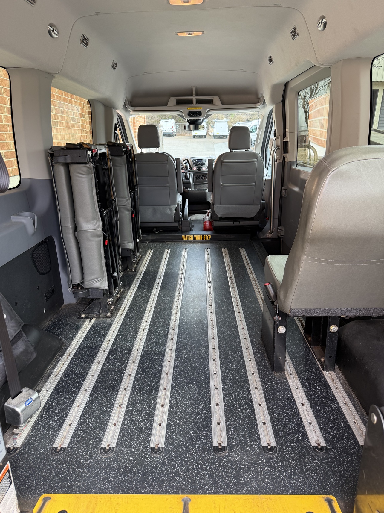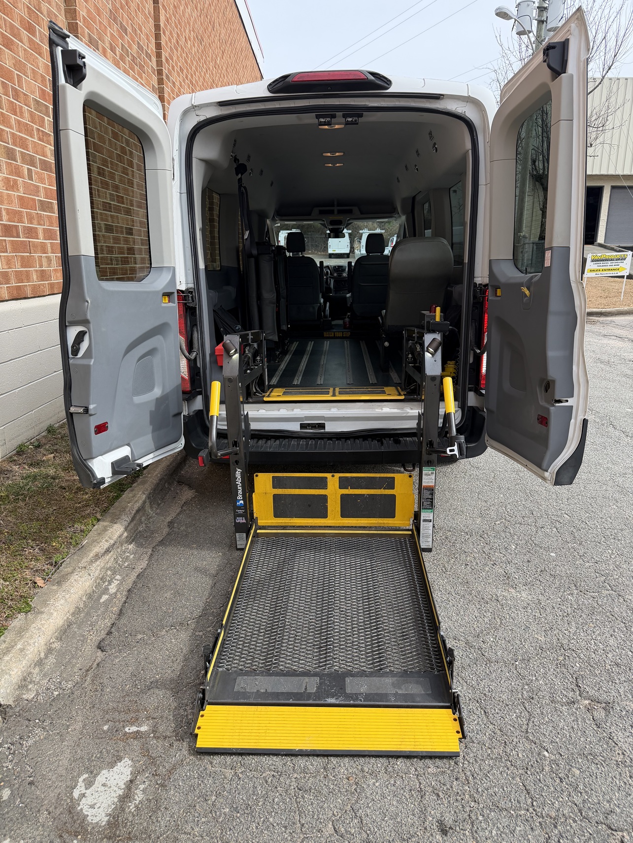 2019 Ford Transit T350 XL Mid-roof, BraunAbility Century Series rear lift, rubber non-skid flooring with L-track flooring fittings, leather seats, cruise control, power windows, power door locks, AM/FM radio, back up camera.