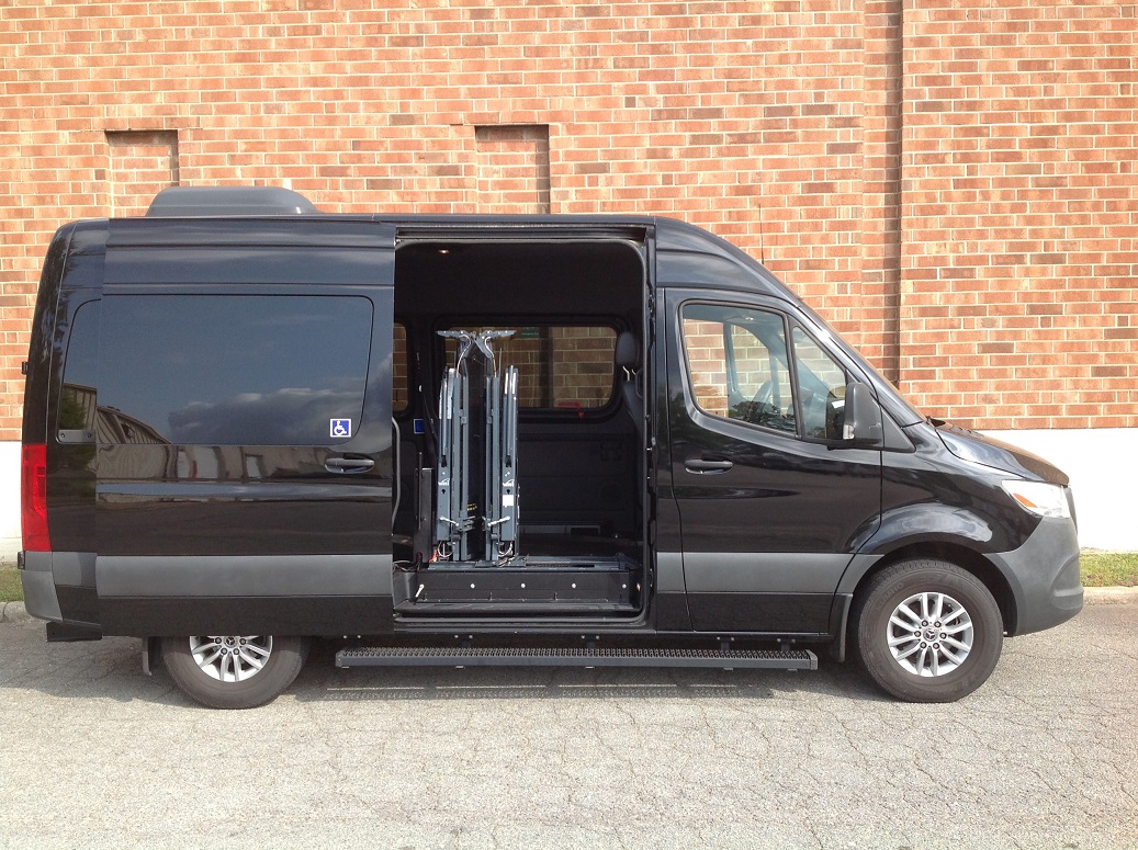 2019 Mercedes Sprinter 2500, high roof, Ricon side platform lift, power door operator, leather seats, blind spot assist, cruise control, back up camera, push button start, anti-theft system, retractable tie downs and seat belts, rubber non-skid flooring. Disability Equipped, Handicap Accessible, Wheelchair accessible, Handicap van, Wheelchair van, Handicap vans, Wheelchair vans