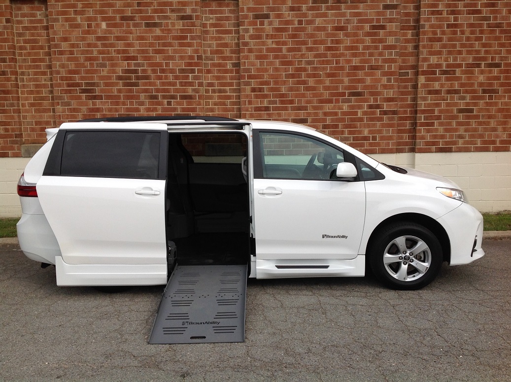 2019 Toyota Sienna LE, BraunAbility RampVan XL power fold out conversion, rubber non-skid flooring, cloth seats, power front drivers seat, power sliding doors, power windows, power liftgate, AM/FM/CD player, back up camera, cruise control.  Disability Equipped, Handicap Accessible, Wheelchair accessible, Handicap van, Wheelchair van, Handicap vans, Wheelchair vans