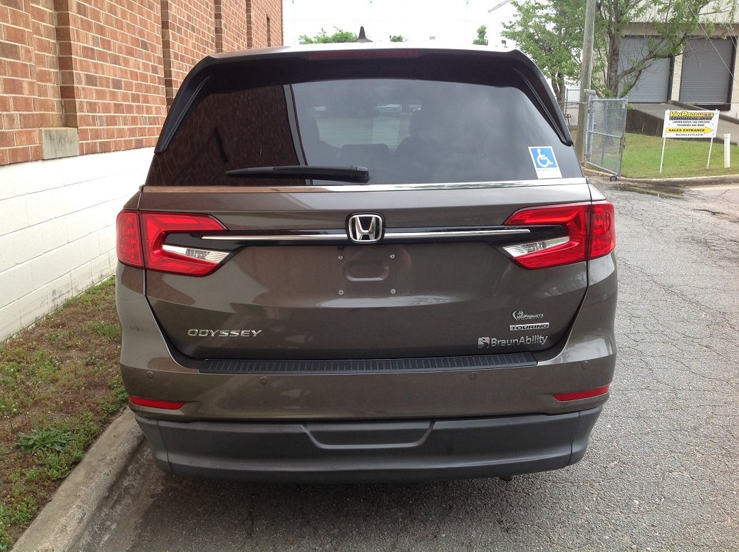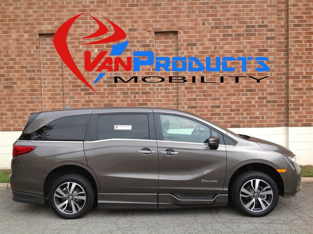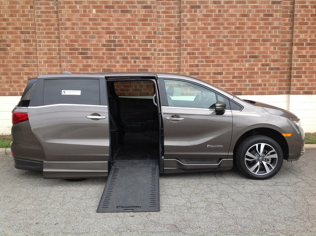 2022 Honda Odyssey Touring, BraunAbility Entervan Xi in-floor conversion, Honda Sensing safety features, vehicle stability assist, auti-lock braking system, electronic brake distribution, tire pressure monitoring system, LED daytime running lights, LATCH child seat anchor system, leather trimmed interior, leather wrapped steering wheel, audio system with 7 speakers, display audio with Honda NAV with voice recognition and multi-view rear camera, Blu-ray/DVD rear entertainment system, Apple CarPlay/Andriod auto compatible, satellite radio, HondaLink with smart phone integration, Bluetooth HandsFreeLink, CabinTalk, CabinControl capability, CabinWatch, USE audio interface, push button start, automatic climate control with rear controls, drivers 12-way power seat with memory, heated front seats, front passenger 8-way power seat, auto dimming rearview mirror, HomeLink system, dual power sliding doors, blind spot monitor with cross traffic monitor, power moonroof with tilt, power tailgate, LED fog lights, heated power door mirrors capless fuel filler LED taillights, front and rear parking sensors, smart key entry system with security system, walk away auto lock, remote engine start, rubber flooring. Disability Equipped, Handicap Accessible, Wheelchair accessible, Handicap van, Wheelchair van, Handicap vans, Wheelchair vans