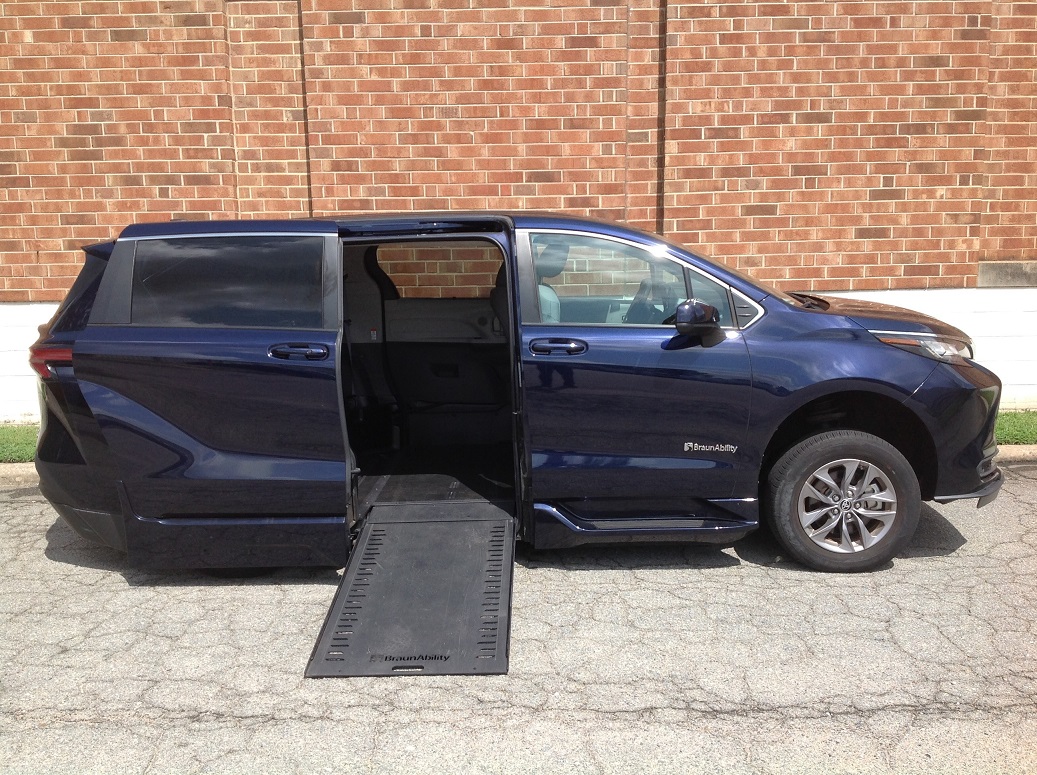 2021 Toyota Sienna LE HV, BraunAbility RampVan Xi power in-floor conversion, rubber flooring, Toyota Safety Sense 2.0, LATCH child seat anchor system, blind spot monitor, remote keyless entry, push button start, LED headlights, dual power sliding doors, heated outside mirrors with integrated blind spot monitor, 8″ touchscreen display, 8 speakers, HandsFree Bluetooth phone/audio, USB media ports, USB charging ports, Android auto and Apple CarPlay compatible, auto climate control with rear controls, fabric-trimmed seats, power driver seat, and more. Disability Equipped, Handicap Accessible, Wheelchair accessible, Handicap van, Wheelchair van, Handicap vans, Wheelchair vans