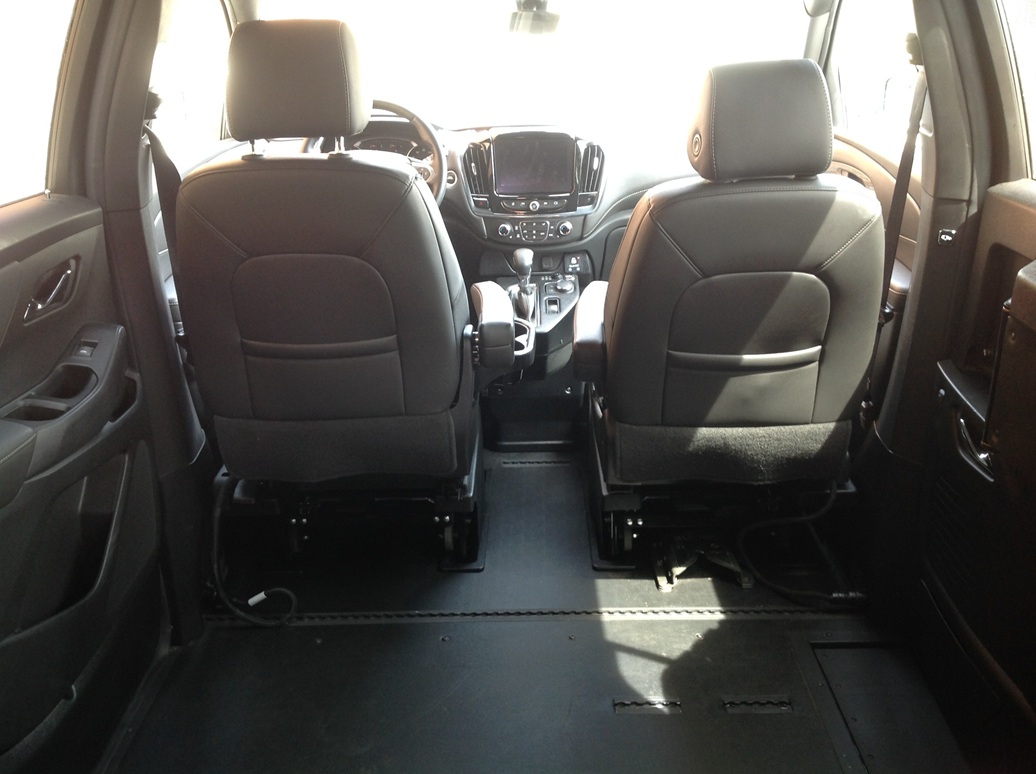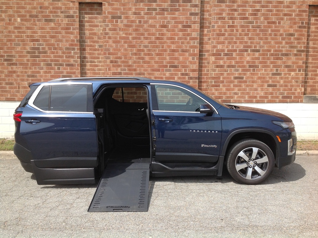 2023 Chevrolet Traverse 3LT, BraunAbility Entervan Xi power in-floor conversion, Premium LT package including outside heated mirrors, Chevrolet infotainment 3 Plus with Navigation, 8″ color touchscreen display, voice recognition, Bluetooth audio streaming and phone, Apple CarPlay and Android Auto, 120-volt power outlet, adaptive cruise control, 20′ wheels, enhanced automatic emergency braking, rear pedestrian alert, Bose premium 10 speaker sound system, trailering equipment package, keyless open and start, remote vehicle start, satellite radio, power driver seat, leather wrapped steering wheel, wireless phone charging, auto climate control with rear controls, LED tail lamp, power rear liftgate, rear cross traffic alert, lane change alert with side blind zone alert, Chevy Safety Assist, rubber flooring. Disability Equipped, Handicap Accessible, Wheelchair accessible, Handicap van, Wheelchair van, Handicap vans, Wheelchair vans