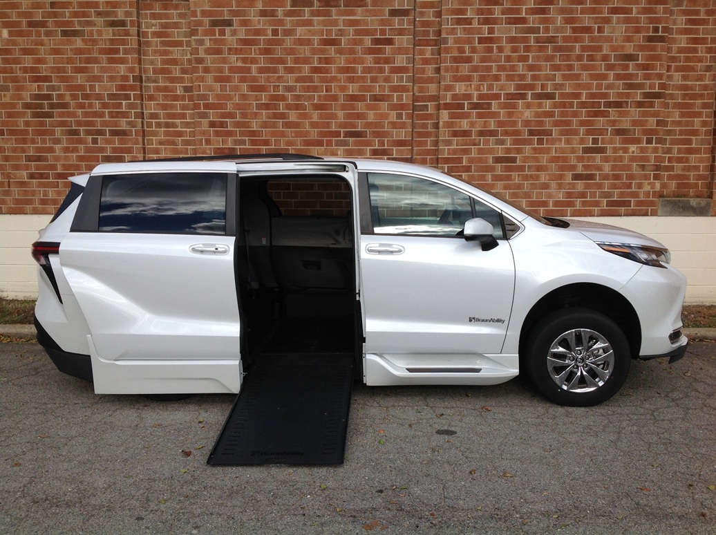 2023 Toyota Sienna XLE Plus HV, BraunAbility RampVan Xi power in-floor conversion, Toyota Safety Sense 2.0, STAR safety system, LATCH child seat anchor system, Blind spot monitor, 5-door smart key with push button start, LED headlights, hands free dual power sliding doors, power liftgate, front and rear parking assist with auto brake, power tilt/slide moonroof, 9″ touchscreen display, HandsFree Bluetooth phone/music, USB media port, 6 USB charge ports, Satellite radio, auto climate control with rear controls, SofTex trimmed seats, heated and power front seats, XLE Plus package including NAV, rubber non-skid flooring. Disability Equipped, Handicap Accessible, Wheelchair accessible, Handicap van, Wheelchair van, Handicap vans, Wheelchair vans