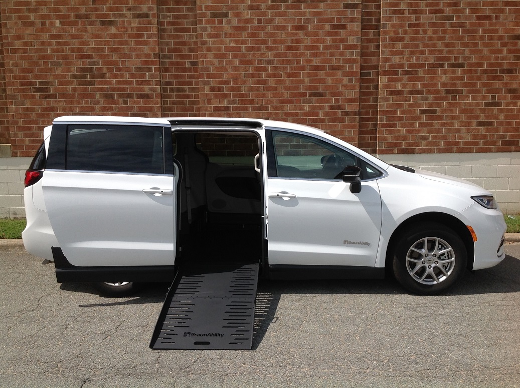 2024 Chrysler Pacifica Touring L, BraunAbility Entervan XT power fold out conversion, SafetyTec package, Adaptive cruise control, blind spot and rear cross path detection, lane departure warning plus, full speed forward collision warning plus, pedestrian emergency braking, advances brake assist, ParkView rear back up camera, ParkSense rear park assist with stop, leather seats, rain sensitive windshield wipers, LATCH child seat anchor system, remote start system, theft deterrent system, push button start, heated front seats, heated steering wheel, 8-way power adjustable driver and passenger seat, driver seat memory, air conditioning with rear controls, Uconnect 5 with 10.1 inch touch screen display, satellite radio, Apple Car Play and Google Android auto, Handsfree phone and audio, power sliding door, power windows, Safety Sphere package. Disability Equipped, Handicap Accessible, Wheelchair accessible, Handicap van, Wheelchair van, Handicap vans, Wheelchair vans